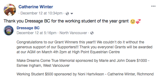 I recently won the Dressage BC Working Student Grant for 2017 and I couldn’t be more thrilled and thankful to DBC and its supporters along with my coach Marcie Doyle. Hannii and I will be using the grant to fund our first show of the season in 2018. What a great start to the year.